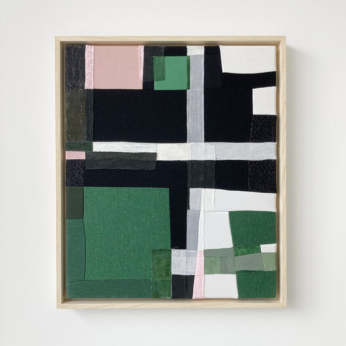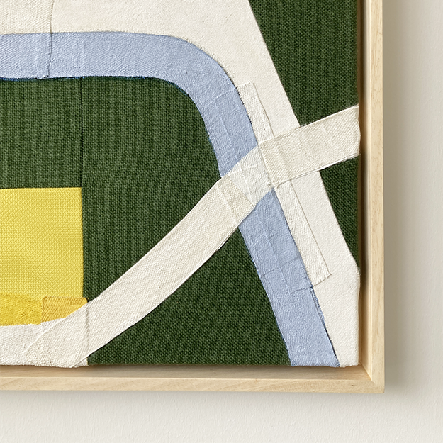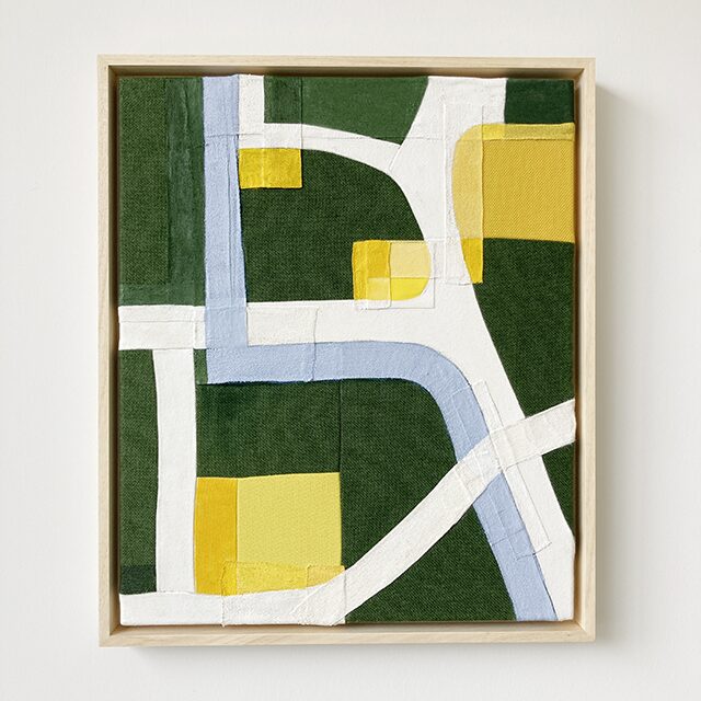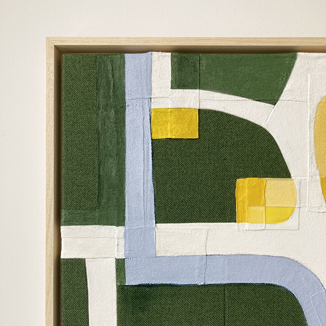This artwork has been created for the exhibition ‘Layers of Connection’ at Artrium in Den Bosch, May 9th – July 14th 2025. Since I am still an urban designer at heart, I approached this theme in relation to the layered city of Den Bosch. Textiles and paint enter into a dialogue, creating new urban landscapes where the connection between history, buildings, public spaces, nature, and people takes center stage.