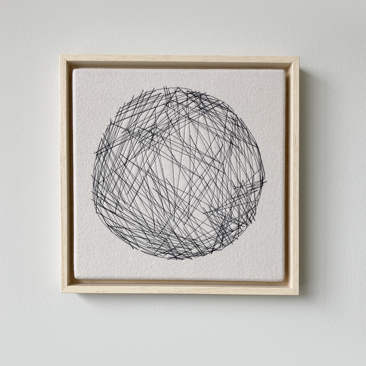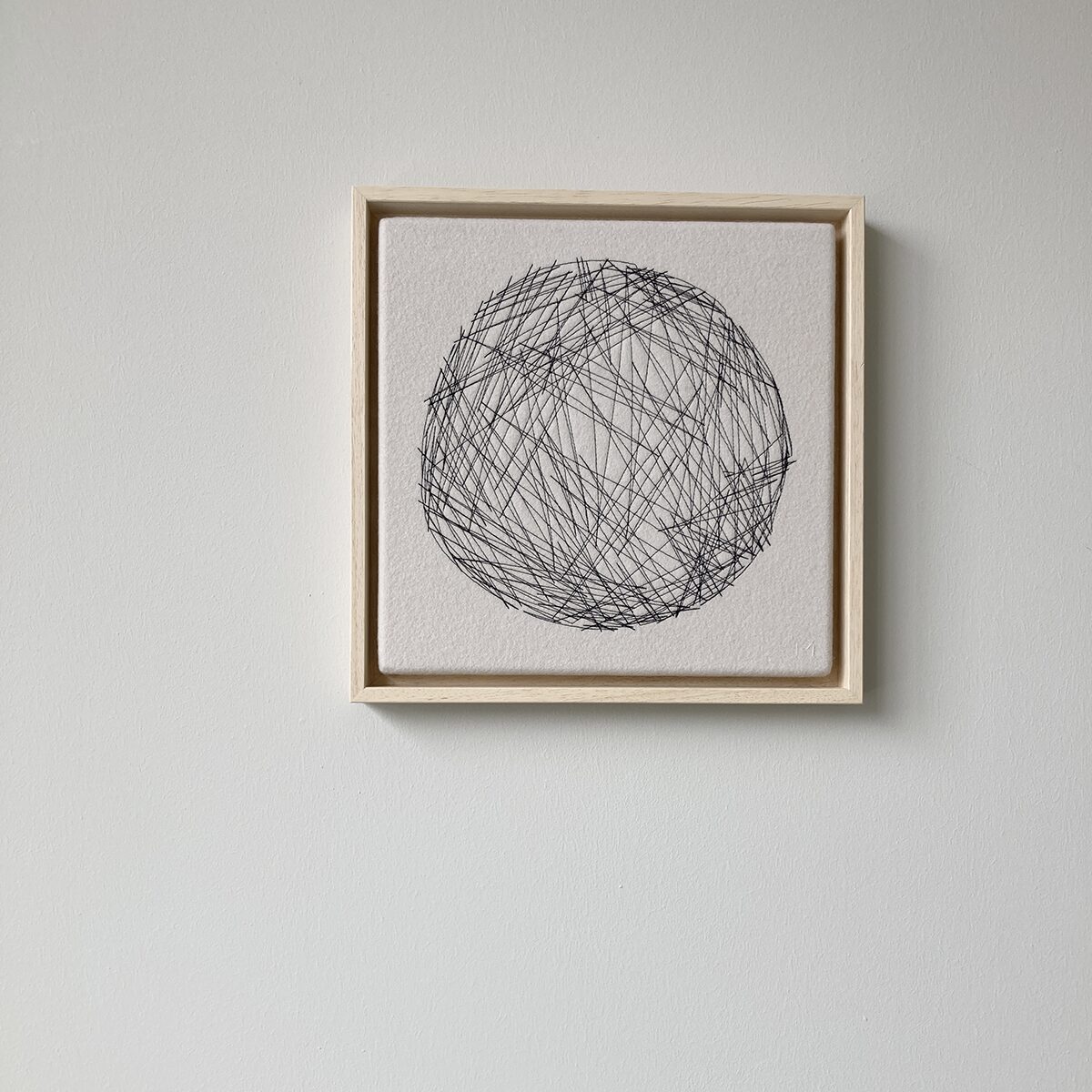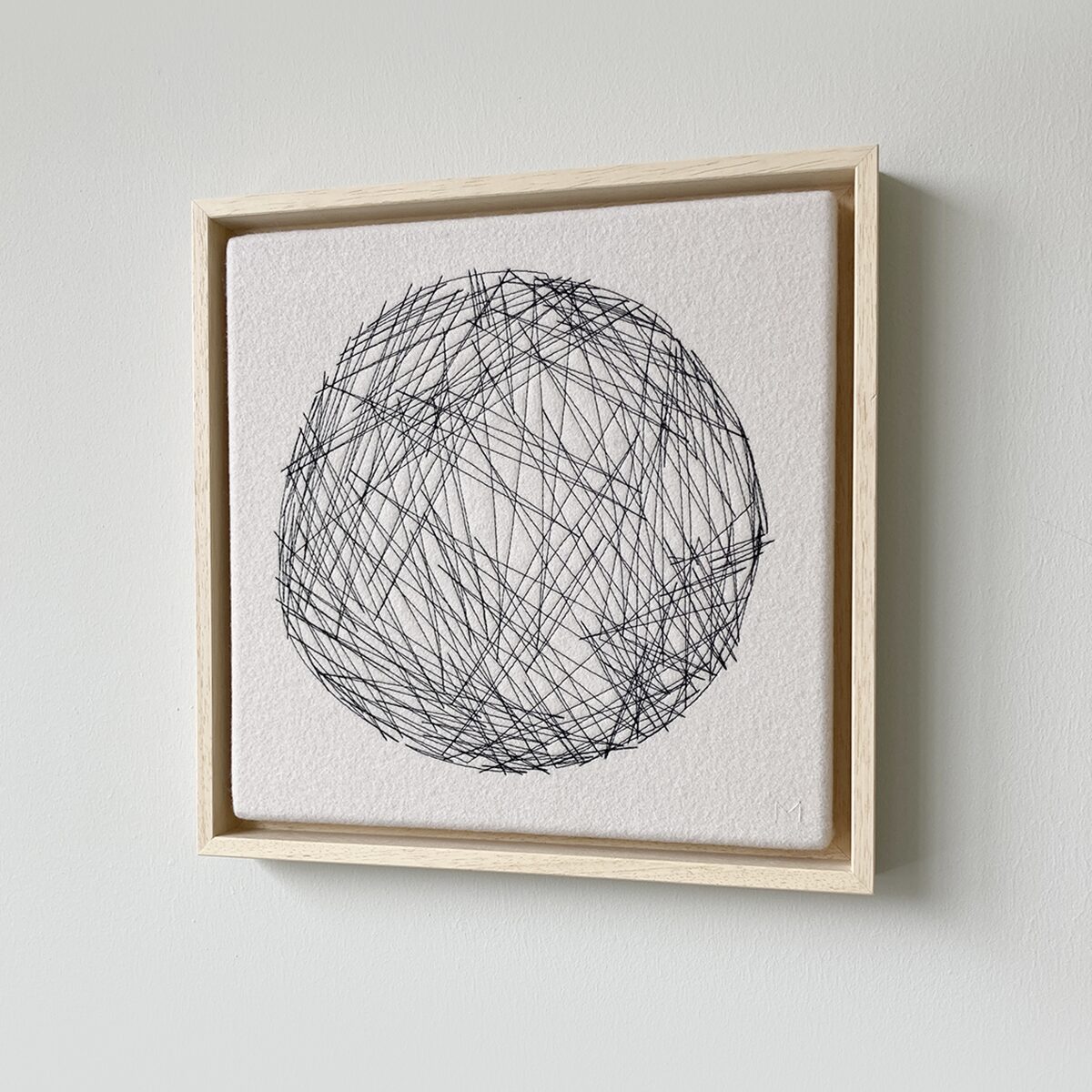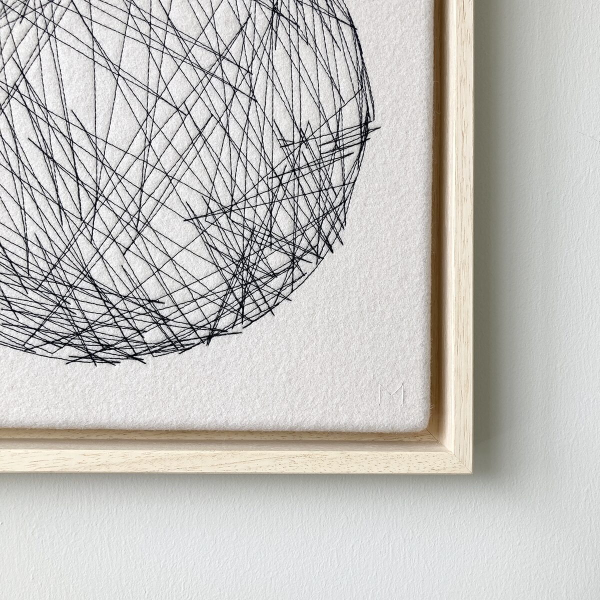 L​ittle Sun is made of off white stretched fabric over which a pattern is stitched with a sewing machine. Because the stitching is hand-embroidered, each ​Little Sun is unique.